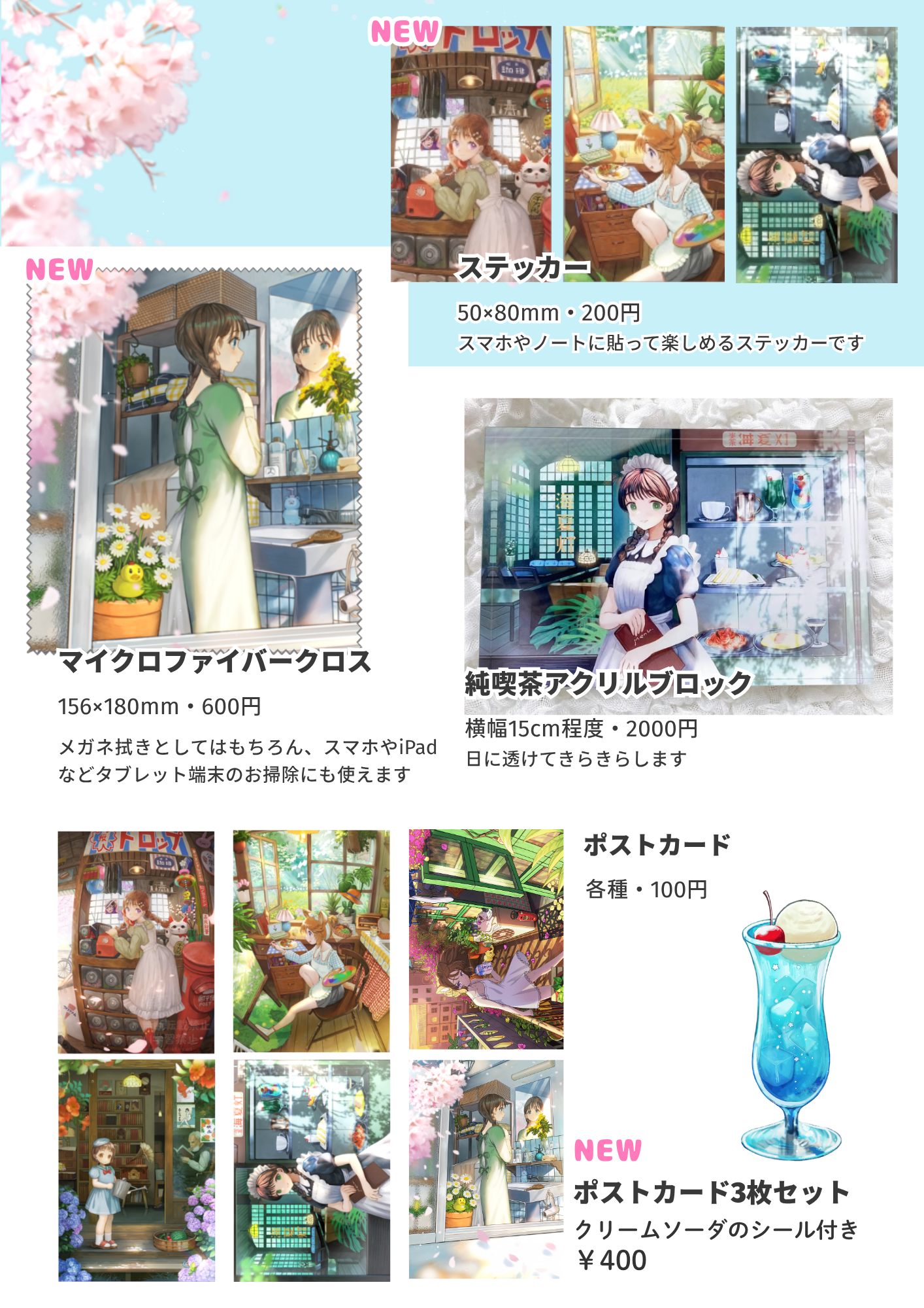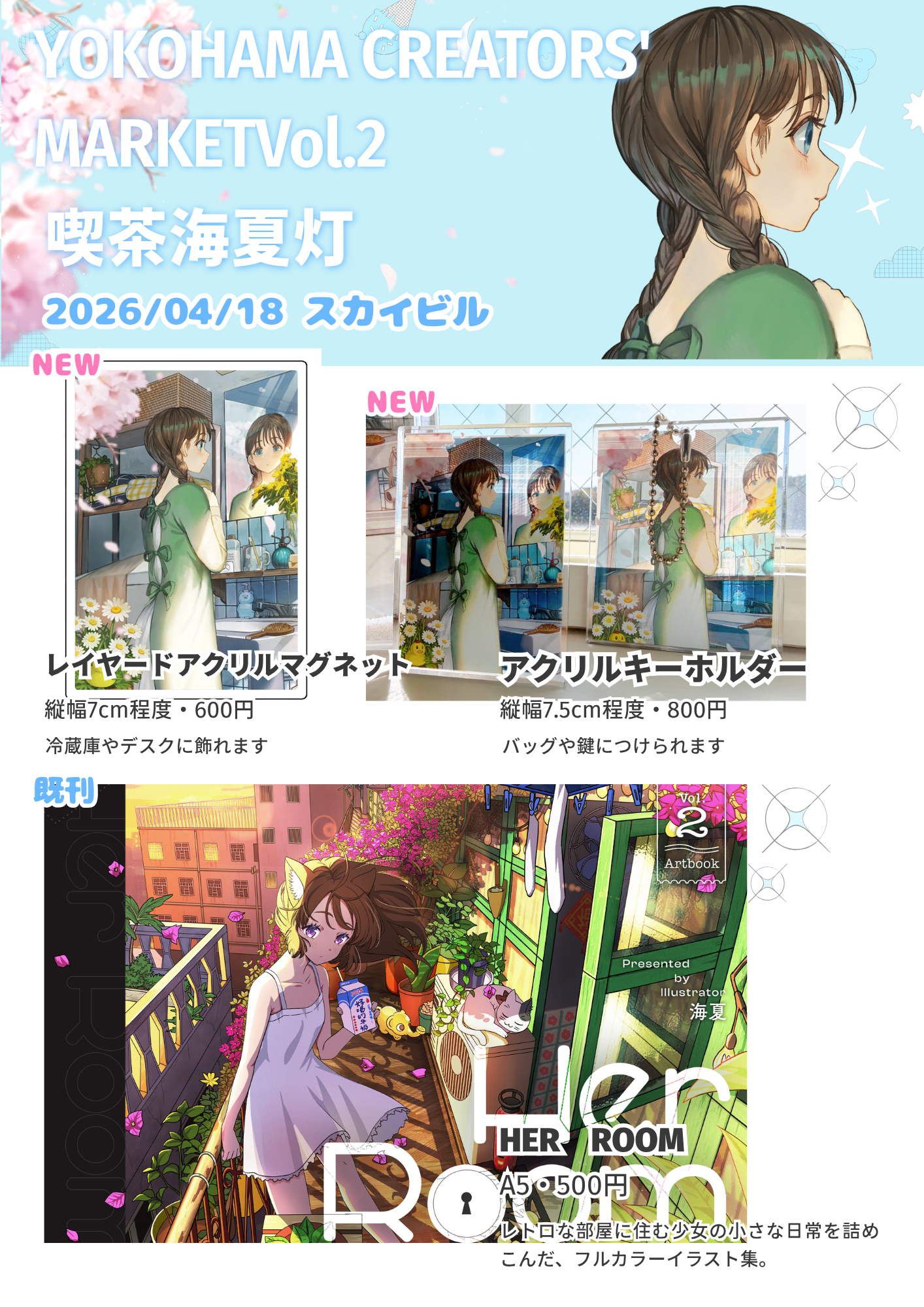 お仕事日常ハマクリ出展のお知らせとお品書き 2026/04/124月18日に開催されるYOKOHAMA CREATORS MARKET Vol.2 に出展します。今回は、レトロな空間に生きる人物をテーマにした作品を中心に、ポストカードやステッカー、アクリルグッズなどを制作しました。新作として、ポストカード3枚セット(おまけシール付)もご用意しています。どれも日常にそっと寄り添うようなイメージで制作していますので、実際に手に取っていただけたら嬉しいです。当日、会場でお会いできるのを楽しみにしています。