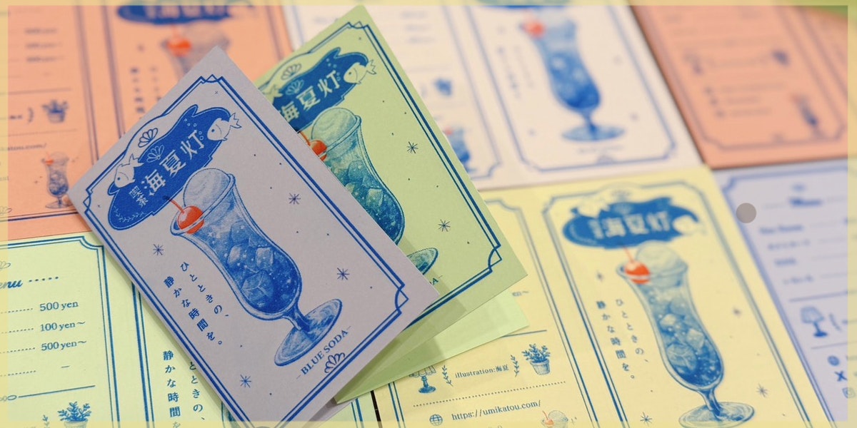 A3の紙に印刷したものをカッターで切り分けて、折りたたんだメニュー表をイメージして作りました。