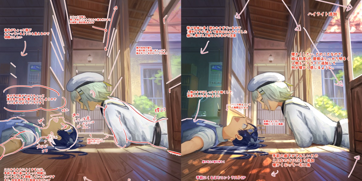 特に手前の床の質感や、縁側から差し込む光の雰囲気などはとても丁寧で、背景付きのイラストに挑戦したい方にとっても参考になる部分が多いと思います。
